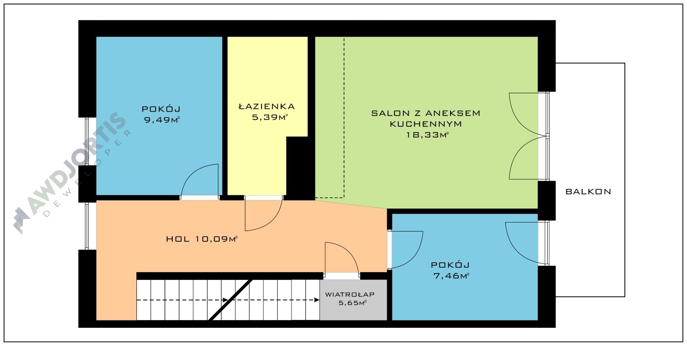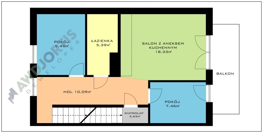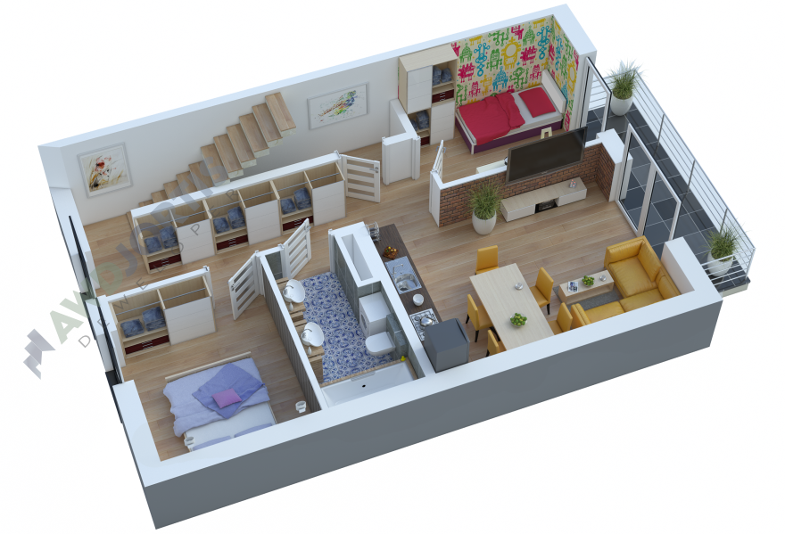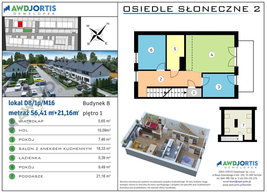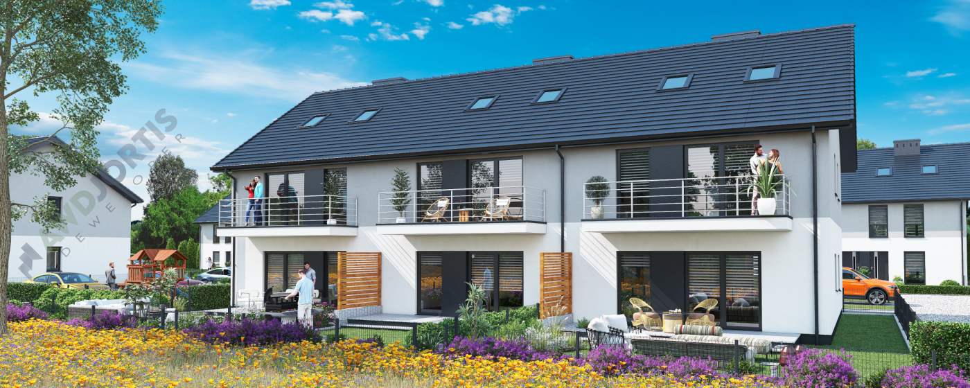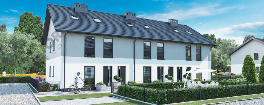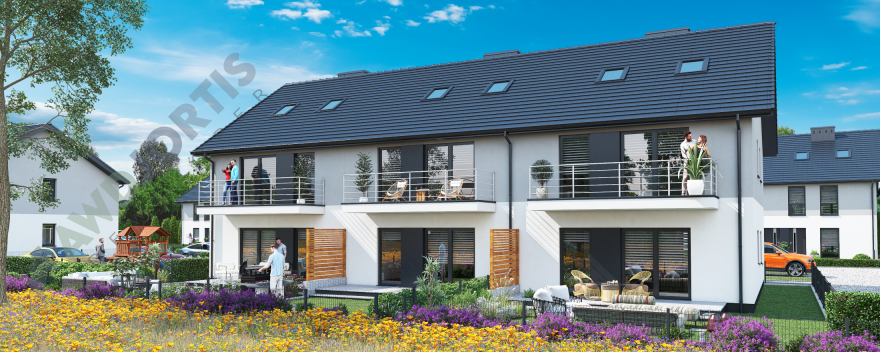 Mieszkanie na piętrze z dwiema sypialniami, salonem z aneksem kuchennym i łazienką. Na poddaszu o powierzchni 21m2 można urządzić dodatkowe pomieszczenie biurowe lub sypialnię oraz dodatkową łazienkę. Przytulne mieszkanie, dogodnie usytuowane z ekspozycją na światło słoneczne z północy i południa. Środkowa lokalizacja sprzyja efektywnemu wykorzystaniu energii cieplnej w okresie zimowym a w okresie letnim zapobiega nadmiernemu nagrzewaniu się pomieszczeń. Okna salonu i głównej sypialni skierowane na północny-zachód.