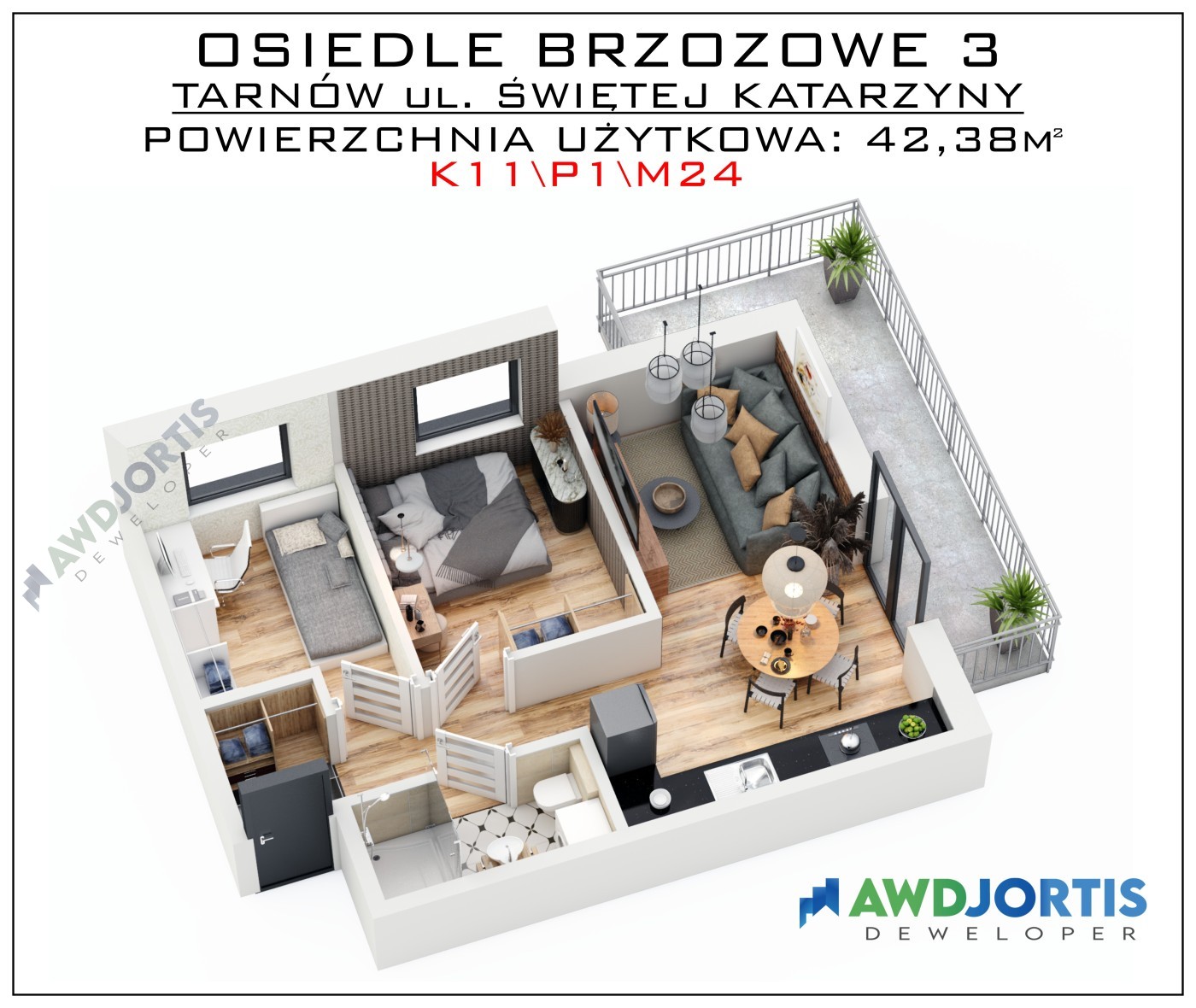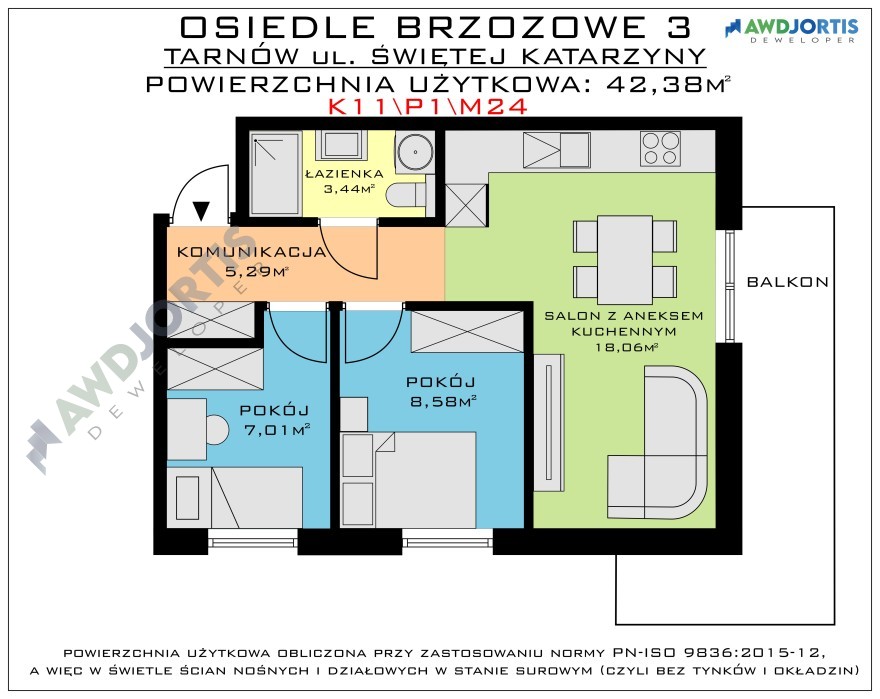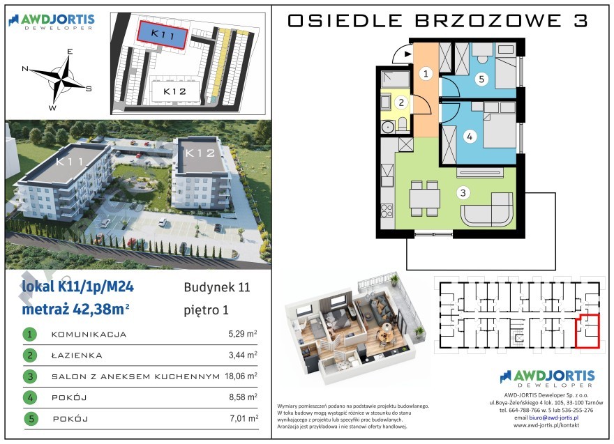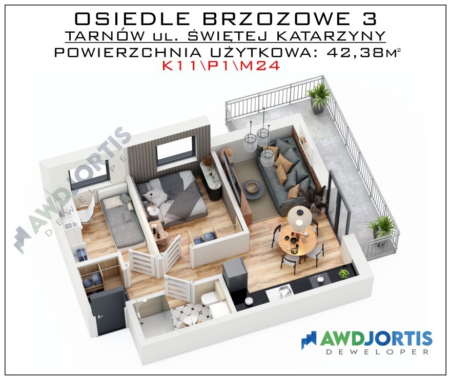 Mieszkanie na pierwszym piętrze z dwoma sypialniami, salonem z aneksem kuchennym i łazienką. Obszerne mieszkanie, dogodnie usytuowane z ekspozycją na światło słoneczne z południa i zachodu.Okna głównej sypialni i salonu skierowane na południe. Okna salonu skierowane na zachód pozwalają cieszyć się promieniami słońca do późnych godzin popołudniowych. Do mieszkania przynależy balkon z wykończoną płytą betonową oraz estetyczną barierką ze stali nierdzewnej. Mieszkanie wyposażone jest w wentylację mechaniczną, ogrzewanie podłogowe we wszystkich pomieszczeniach, dwufunkcyjny kocioł gazowy oraz energooszczędne drzwi i okna wysokiej jakości. Dla wygody mieszkańców budynek wyposażony jest w cichobieżną windę. Na życzenie klienta, istnieje możliwość dokupienia dodatkowego miejsca postojowego oraz komórki lokatorskiej na tej samej kondygnacji.