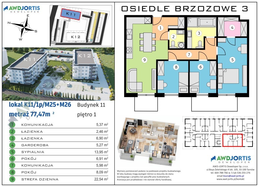 Mieszkanie na pierwszym piętrze z trzema sypialniami, salonem z aneksem kuchennym, łazienką i toaletą oraz garderobą sypialni głównej. Tuż przy wejściu do mieszkania domownicy i gościę mają do dyspozycji praktyczną szatnię. Mieszkanie jest bardzo przestronne i dogodnie usytuowane w pobliżu wejścia głównego. Okna głównej sypialni i salonu skierowane na zachód, pozwalają cieszyć się promieniami słońca do późnych godzin popołudniowych. Do mieszkania przynależą dwa duże balkony oraz dwa miejsca postojowe. Mieszkanie wyposażone jest w wentylację mechaniczną, ogrzewanie podłogowe we wszystkich pomieszczeniach, dwufunkcyjny kocioł gazowy oraz energooszczędne drzwi i okna wysokiej jakości. Na życzenie klienta, istnieje możliwość dokupienia dodatkowego miejsca postojowego oraz komórki lokatorskiej. Mieszkanie może być zaaranżowane identycznie jak bliźniacze mieszkanie M14+M15. Kliknij tutaj, aby zobaczyć układ mieszkania M14+M15. Zyskuje się wtedy oddzielną garderobę, jednakowy metraż obu mniejszych sypialni, większy salon oraz dwie pełne łazienki z wanną lub prysznicem.
