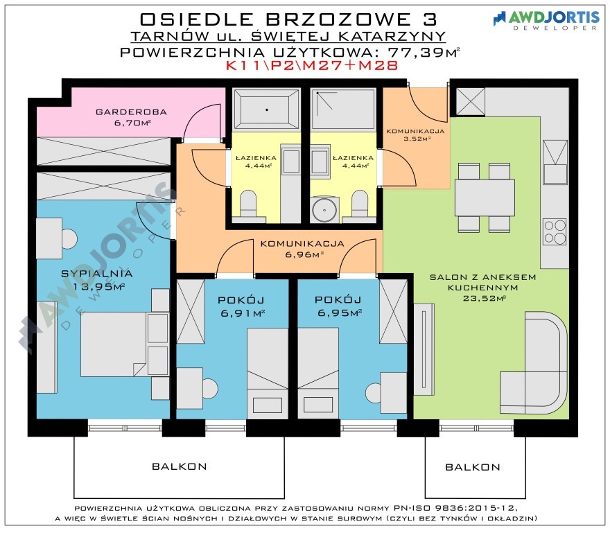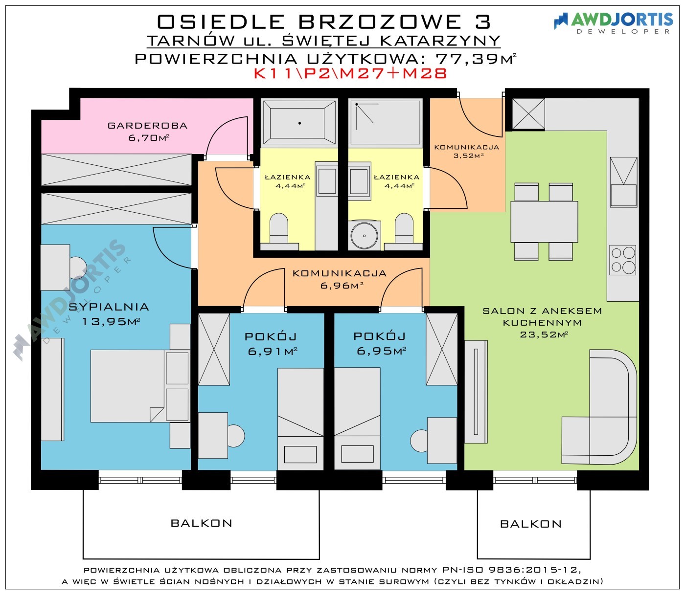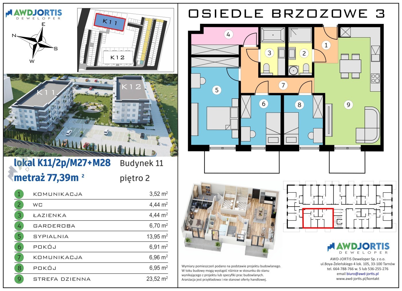 Mieszkanie na drugim piętrze z trzema sypialniami, salonem z aneksem kuchennym, dwiema pełnymi łazienkami oraz odddzielną garderobą, którą można zaaranżować w dowolny, wybrany przez siebie sposób (np. na pomieszczenie biurowe). Mieszkanie jest bardzo przestronne i dogodnie usytuowane w pobliżu wejścia głównego. Okna głównej sypialni i salonu skierowane na zachód, pozwalają cieszyć się promieniami słońca do późnych godzin popołudniowych. Do mieszkania przynależą dwa duże balkony oraz dwa miejsca postojowe. Mieszkanie wyposażone jest w wentylację mechaniczną, ogrzewanie podłogowe we wszystkich pomieszczeniach, dwufunkcyjny kocioł gazowy oraz energooszczędne drzwi i okna wysokiej jakości. Na życzenie klienta, istnieje możliwość dokupienia dodatkowego miejsca postojowego oraz komórki lokatorskiej. Mieszkanie może być zaaranżowane identycznie jak bliźniacze mieszkanie M38+M39. Kliknij tutaj, aby zobaczyć układ mieszkania M38+M39. Zyskuje się wtedy większą łazienkę, wygodną garderobę z bezpośrednim wejściem do głównej sypilani, zróżnicowany metraż dwóch sypialni mniejszych oraz obszerną i funkcjonalną szatnię tuż przy wejściu do mieszkania.