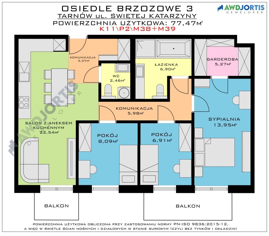 Mieszkanie na drugim piętrze z trzema sypialniami, salonem z aneksem kuchennym, łazienką i toaletą oraz garderobą sypialni głównej. Tuż przy wejściu do mieszkania domownicy i gościę mają do dyspozycji praktyczną szatnię. Mieszkanie jest bardzo przestronne i dogodnie usytuowane w pobliżu wejścia głównego. Okna głównej sypialni i salonu skierowane na zachód, pozwalają cieszyć się promieniami słońca do późnych godzin popołudniowych. Do mieszkania przynależą dwa duże balkony oraz dwa miejsca postojowe. Mieszkanie wyposażone jest w wentylację mechaniczną, ogrzewanie podłogowe we wszystkich pomieszczeniach, dwufunkcyjny kocioł gazowy oraz energooszczędne drzwi i okna wysokiej jakości. Na życzenie klienta, istnieje możliwość dokupienia dodatkowego miejsca postojowego oraz komórki lokatorskiej. Mieszkanie może być zaaranżowane identycznie jak bliźniacze mieszkanie M27+M28. Kliknij tutaj, aby zobaczyć układ mieszkania M27+M28. Zyskuje się wtedy oddzielną garderobę, jednakowy metraż obu mniejszych sypialni, większy salon oraz dwie pełne łazienki z wanną lub prysznicem.