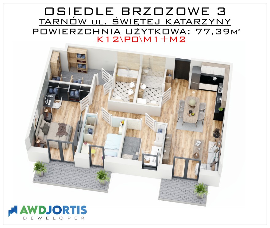 Wyjątkowe mieszkanie parterowe z ogródkiem – idealne dla rodziny ceniącej przestrzeń i prywatność! Odkryj przestronne mieszkanie na parterze w stanie deweloperskim, gotowe do Twojej indywidualnej aranżacji. Trzy sypialnie, salon z aneksem kuchennym, dwie pełne łazienki oraz elastyczna garderoba (do zaaranżowania np. jako biuro) – wszystko w dogodnej lokalizacji blisko głównego wejścia. Okna głównej sypialni i salonu wychodzą na zachód, wypełniając wnętrze naturalnym światłem przez cały dzień. Do mieszkania należy duży ogródek z tarasem oraz dwa miejsca postojowe. Panelowe ogrodzenie zapewnia pełną prywatność i komfortową strefę tylko dla Ciebie – zero sąsiadów za płotem! Nowoczesne udogodnienia gwarantują wygodę na lata: wentylacja mechaniczna, ogrzewanie podłogowe w każdym pomieszczeniu, dwufunkcyjny kčioł gazowy oraz energooszczędne drzwi i okna premium. Na życzenie dokupisz dodatkowe miejsce postojowe lub komórkę lokatorską. Inspiracja? Zaaranżuj je jak bliźniacze M12+M13: zyskasz większą łazienkę, garderobę z wejściem z głównej sypialni, zróżnicowane sypialnie i praktyczną szatnię przy wejściu. Zobacz układ M12+M13 tutaj. Nie czekaj – to szansa na wymarzone miejsce w zasięgu ręki! Skontaktuj się dziś i zacznij planować swoje wnętrze.